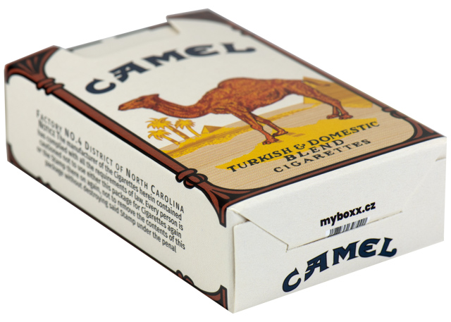 Pevná skládací papírová krabička myBOXX s RETRO motivem CAMEL Choice Quality slouží jako obal na běžnou velikost cigaretových krabiček.