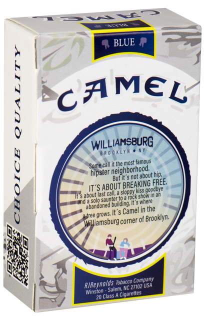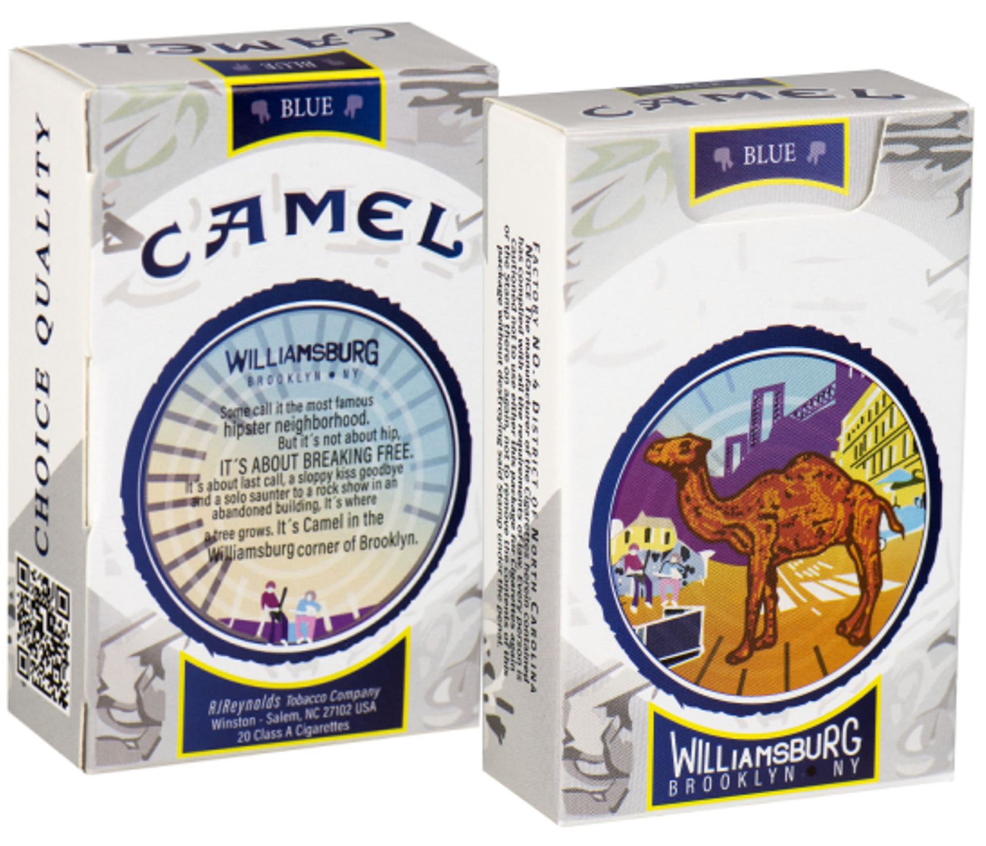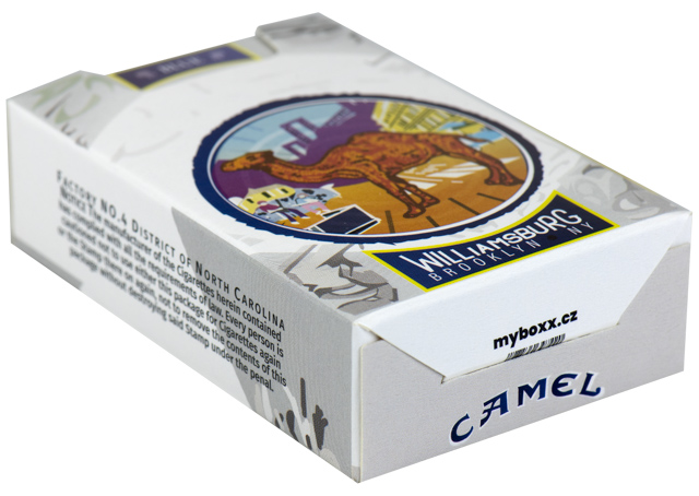 Pevná skládací papírová krabička myBOXX s RETRO motivem CAMEL Williamsburg Brooklyn slouží jako obal na běžnou velikost cigaretových krabiček.