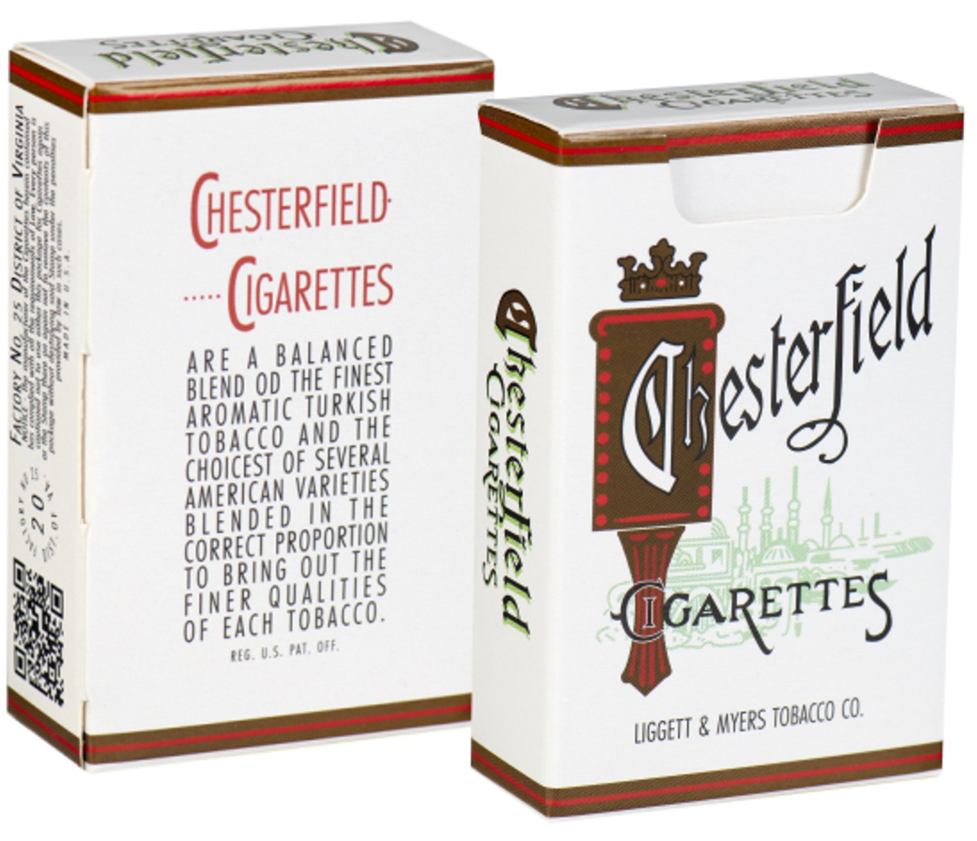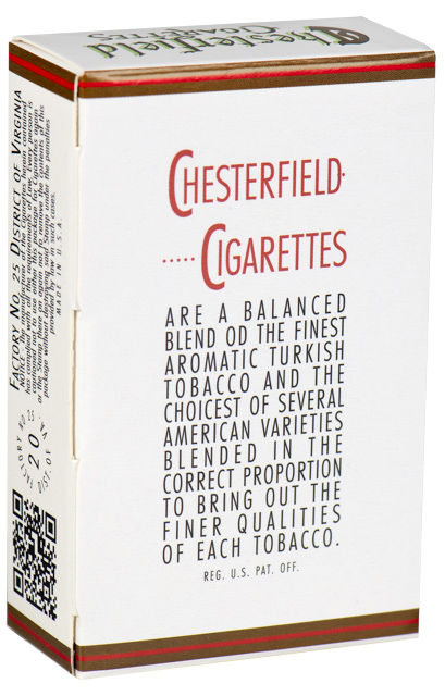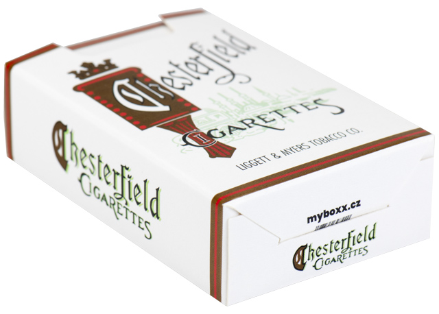 Pevná skládací papírová krabička myBOXX s RETRO motivem CHESTERFIELD Red slouží jako obal na běžnou velikost cigaretových krabiček.