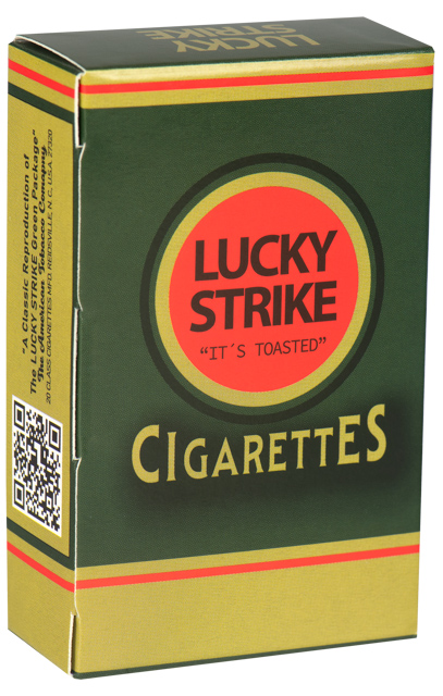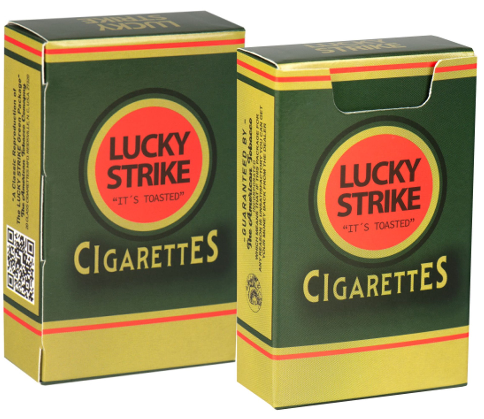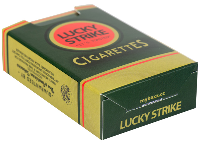 Pevná skládací papírová krabička myBOXX s RETRO motivem Lucky Strike Green slouží jako obal na běžnou velikost cigaretových krabiček.