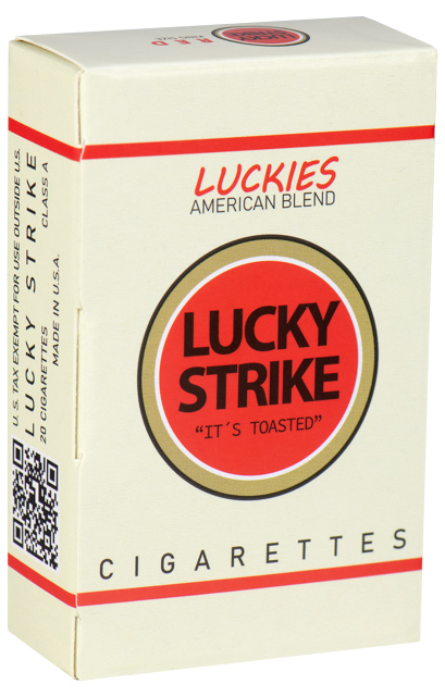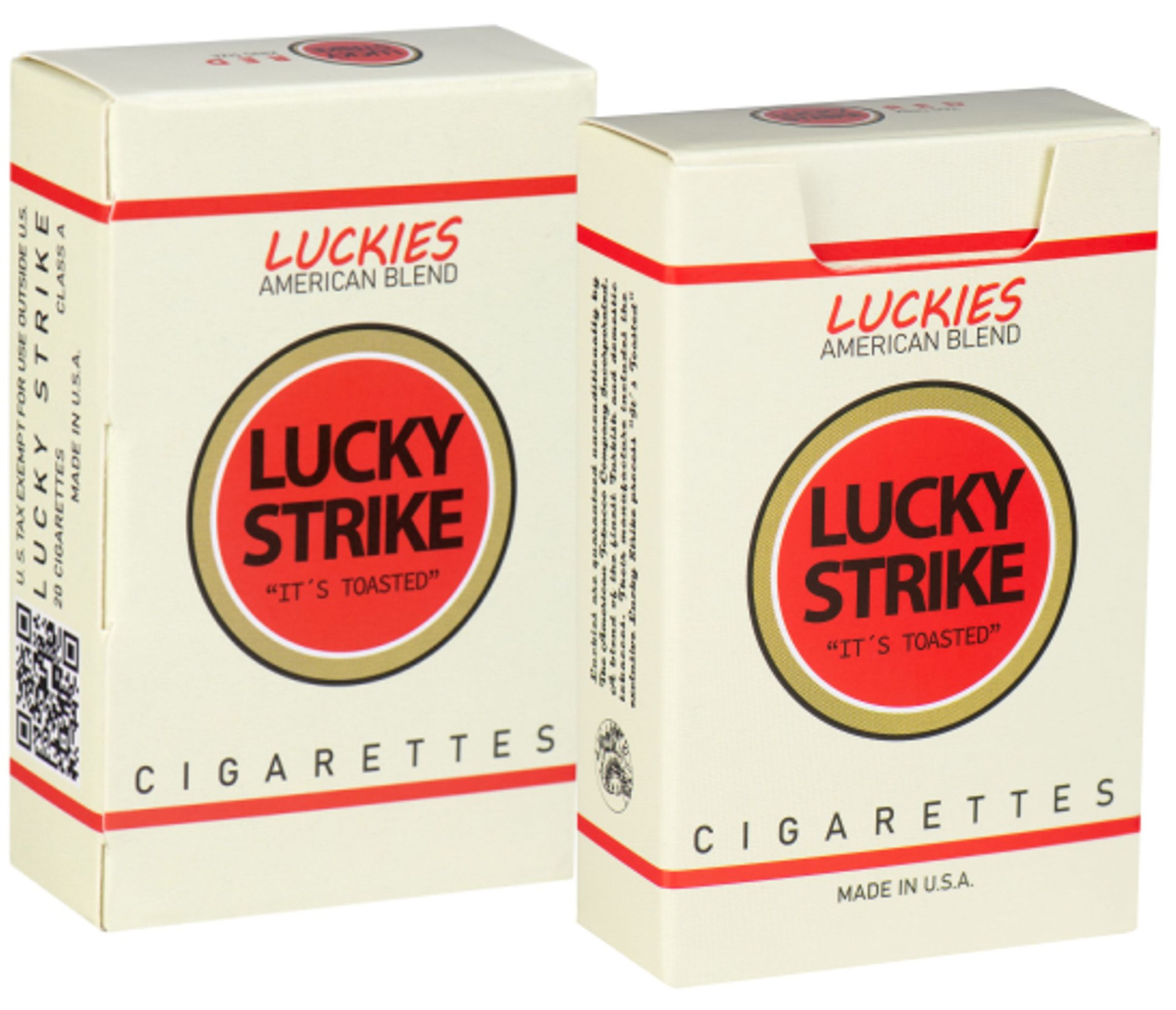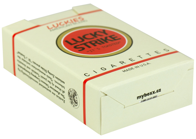 Pevná skládací papírová krabička myBOXX s RETRO motivem Lucky Strike Red slouží jako obal na běžnou velikost cigaretových krabiček.
